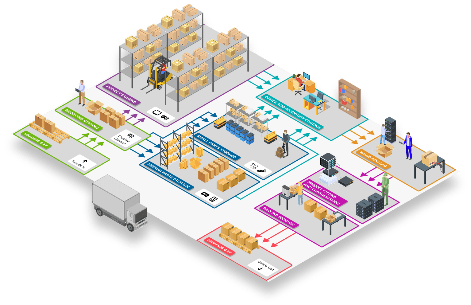 From Goods In to the Loading Bay and Receiving Staging, every item is unloaded, checked, and scanned, keeping your AV inventory accurate and ready for storage or project prep while streamlining warehouse operations.