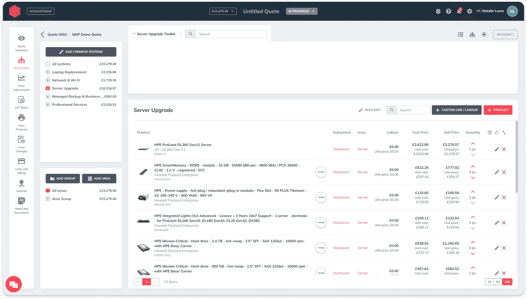 Save hours on every quote with our intuitive quote editor, allowing you to add your favourite equipment and IT brands with just one click. Rapidly build and clone proposals with custom product bundles for maximum efficiency.
