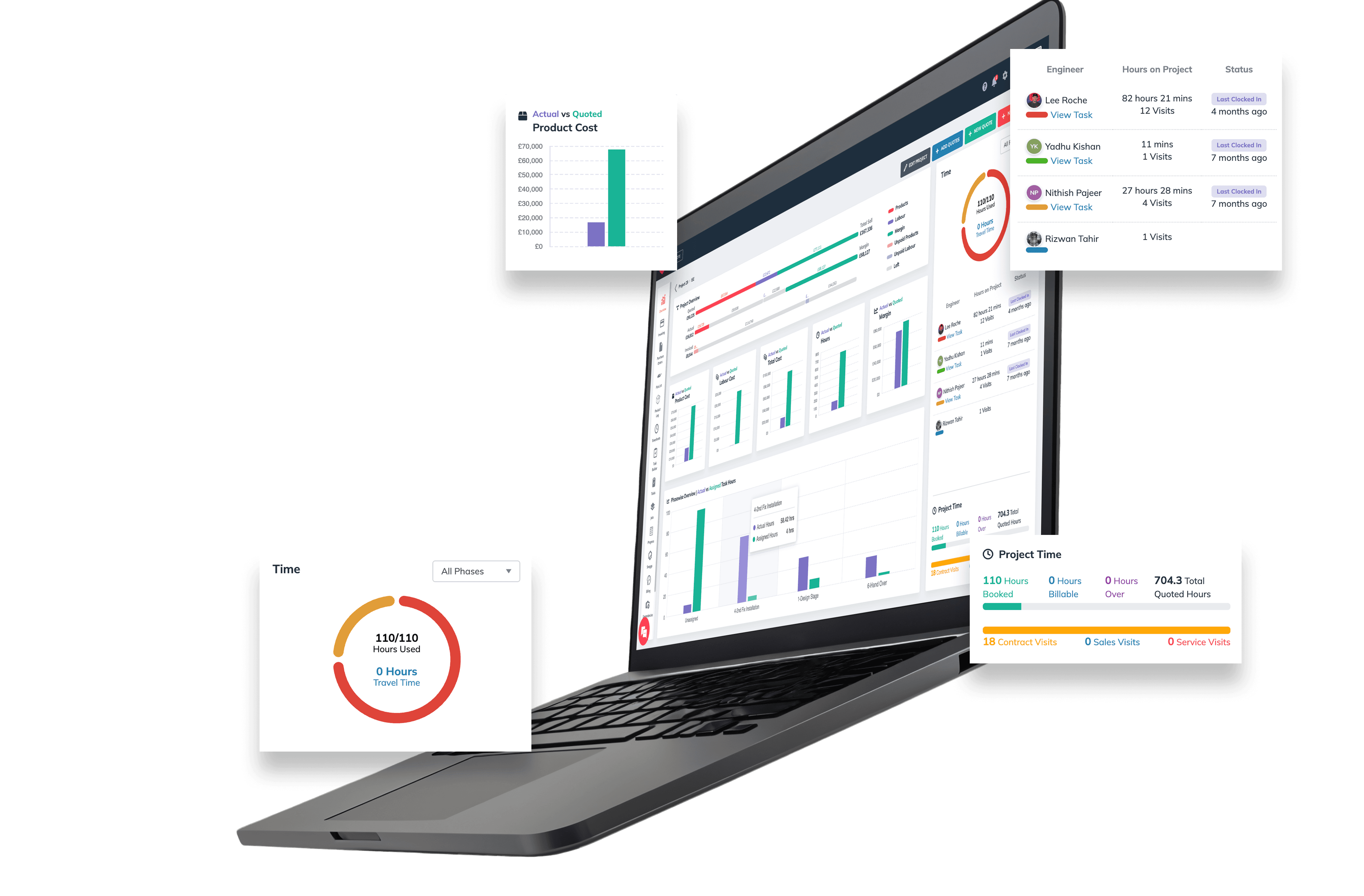 View time, money, and materials in one place. Gain total control over project costs with live visibility into profitability, planned vs. actuals, and margin alerts.