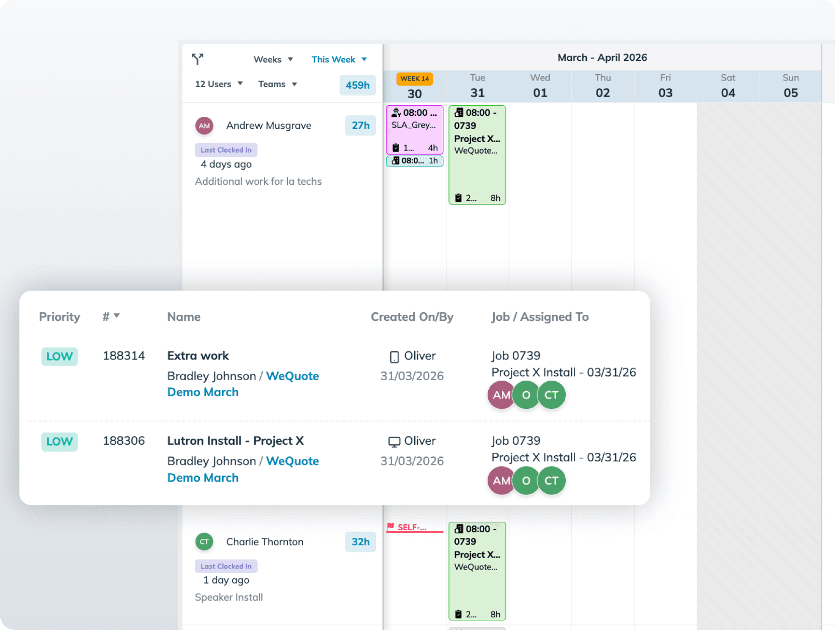 WeQuote Service & Maintenance allows AV project managers to create, schedule, and manage service jobs independently or alongside existing projects. It ensures that all maintenance work scheduled or reactive is fully trackable, billable, and tied to client records.