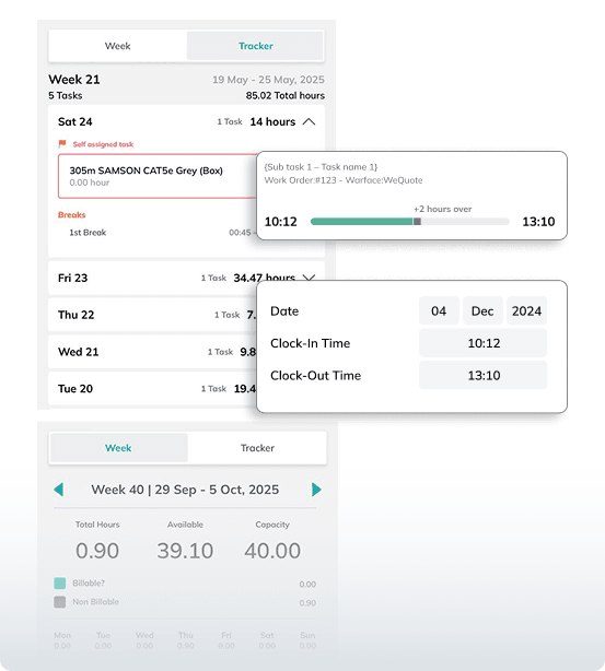 Clock in and out of jobs, log travel time and track hours spent on-site straight from a phone. Time is tied to specific jobs and tasks, automatically syncing to WorkHub for payroll, labour costing and profitability analysis.