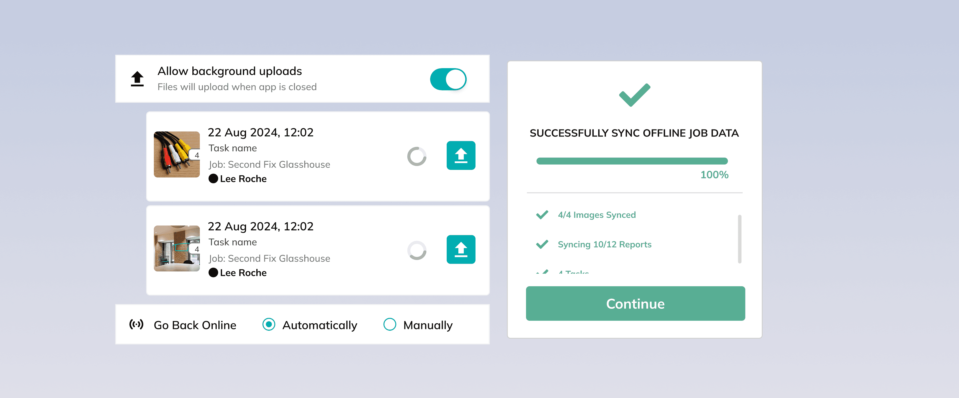 Field work doesn’t stop when the signal drops. Snagg works offline, storing all time entries, photos and notes locally, then automatically syncing back once the connection is restored.
